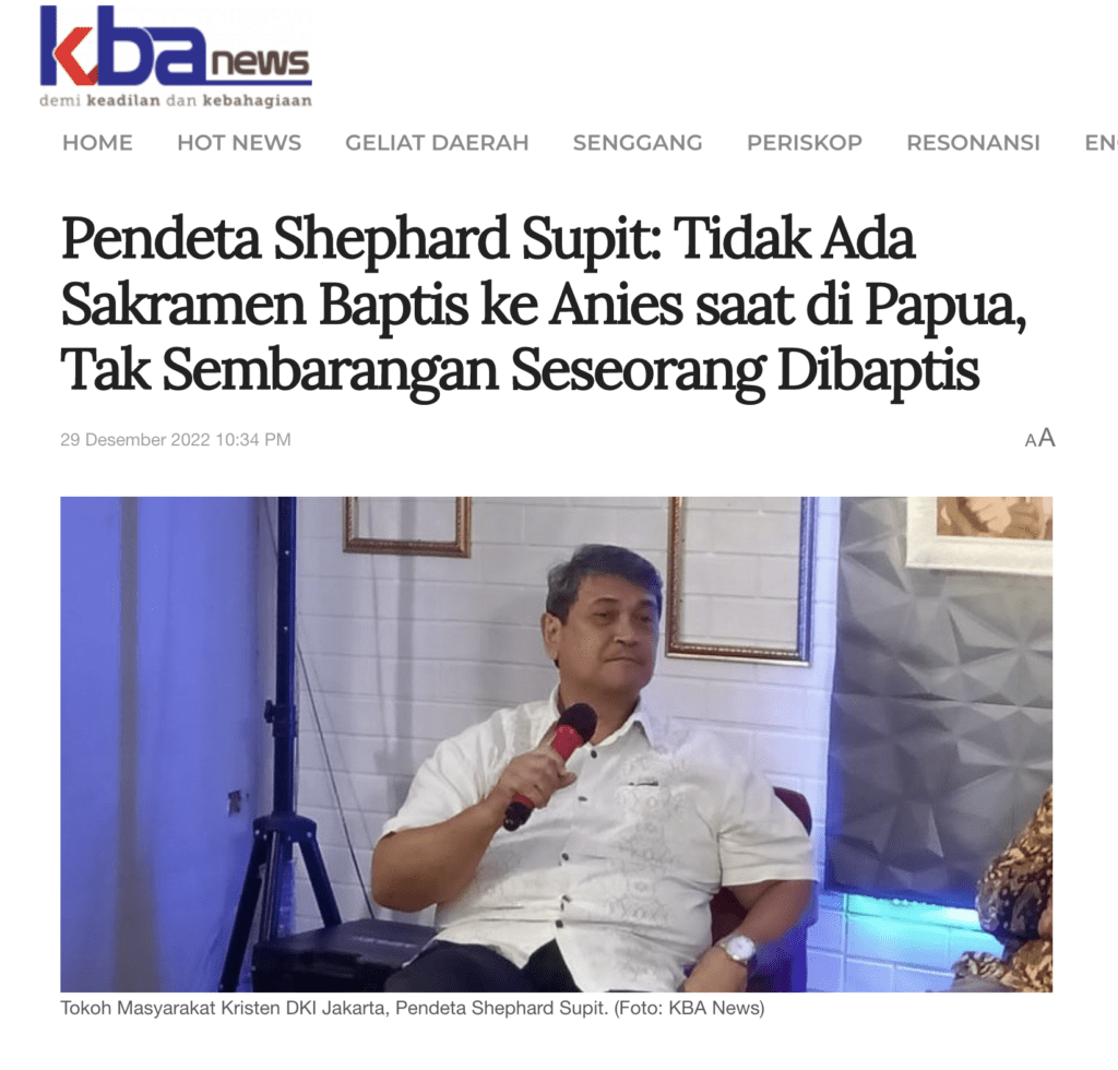Beredar kabar mengenai prosesi baptis Anies Baswedan yang ramai diperbincangkan setelah kunjungannya ke Rumah Doa Alfa Omega yang berlokasi di Sentani, Jayapura, pada 9 Desember 2022.