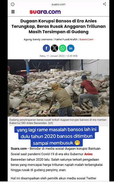 Isu dugaan korupsi bantuan sosial saat pandemi Covid-19 di era Gubernur Anies Baswedan 2020 lalu, kembali menjadi perbincangan hangat di media sosial. Salah satunya terkait beras yang mencapai harga triliunan rupiah dikabarkan terbengkalai hingga rusak di gudang penyimpanan.