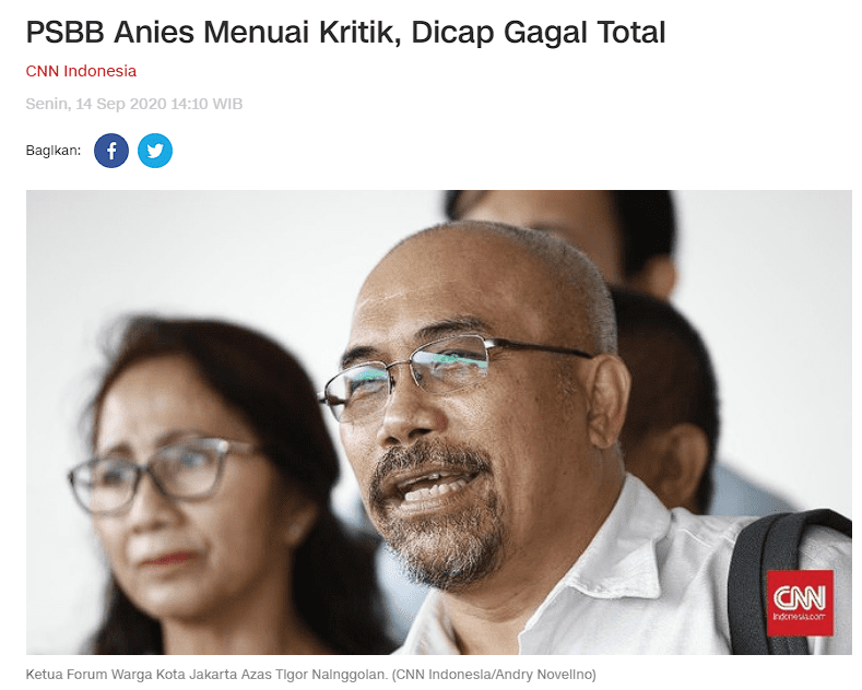 Dalam artikel tersebut, Ketua Forum Warga Kota Jakarta, Azaz Tigor Nainggolan menilai keputusan Pemprov DKI Jakarta dalam menetapkan kembali PSBB secara total merupakan bukti kegagalan Anies Baswedan dalam menangani wabah virus Covid-19 di Jakarta.