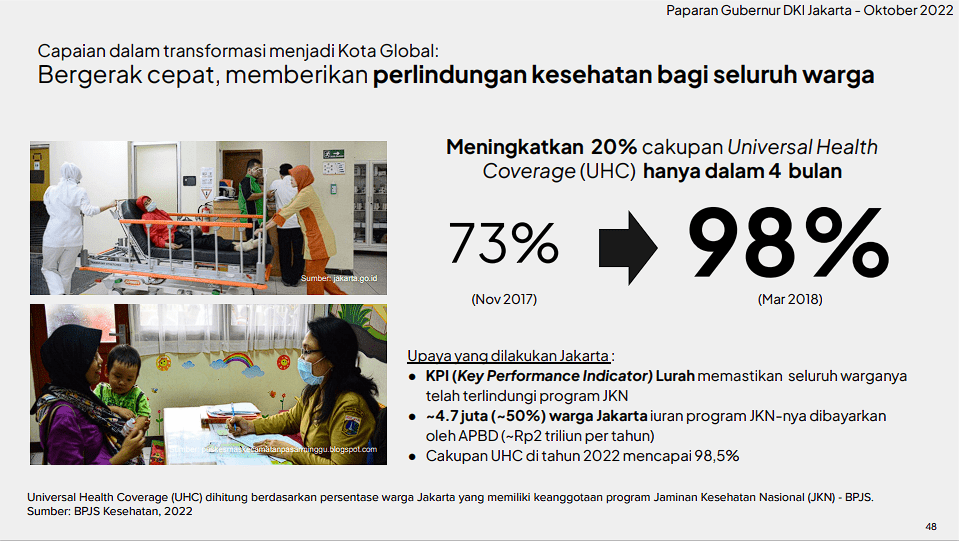 Kemudian, upaya lain yang dilakukan adalah mewujudkan Jaminan Kesehatan Ekstra bagi warga Jakarta melalui program JKN atau Jaminan Kesehatan Nasional. Pada masa menjabat, Anies berhasil meningkatkan 20% keanggotaan program JKN dalam kurun waktu hanya 4 bulan. Anies turut melibatkan para lurah untuk memastikan seluruh warganya telah terlindungi program tersebut.