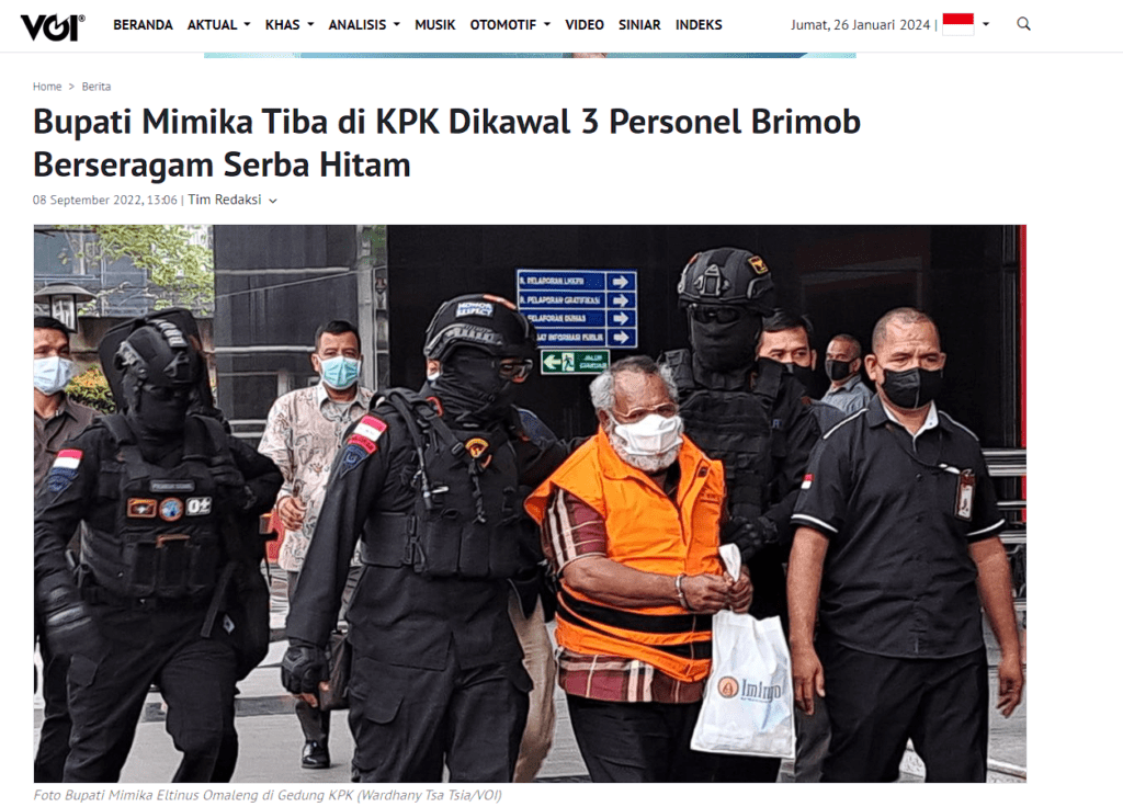 Tim Redaksi VOI. (2022). Bupati Mimika Tiba di KPK Dikawal 3 Personel Brimob Berseragam Serba Hitam. Diakses pada 25 Januari 2024 dari https://voi.id/berita/208032/bupati-mimika-tiba-di-kpk-dikawal-3-personel-brimob-berseragam-serba-hitam