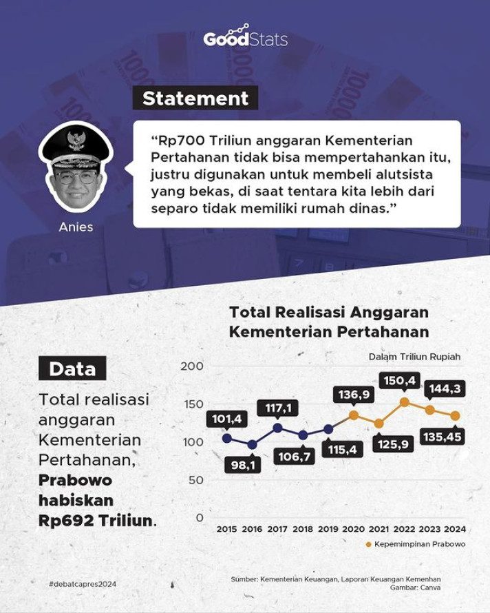 Salah satu pernyataan Anies Baswedan dalam debat capres sesi ketiga yang diselenggarakan pada 7 Januari 2024, ramai menjadi perbincangan masyarakat. Anies menyampaikan bahwa anggaran Kementerian Pertahanan yang mencapai Rp 700 triliun dinilai belum mampu mengamankan Indonesia dari sejumlah kasus serangan pertahanan. Anggaran tersebut salah satunya justru digunakan untuk belanja alat utama sistem senjata (alutsista) bekas.