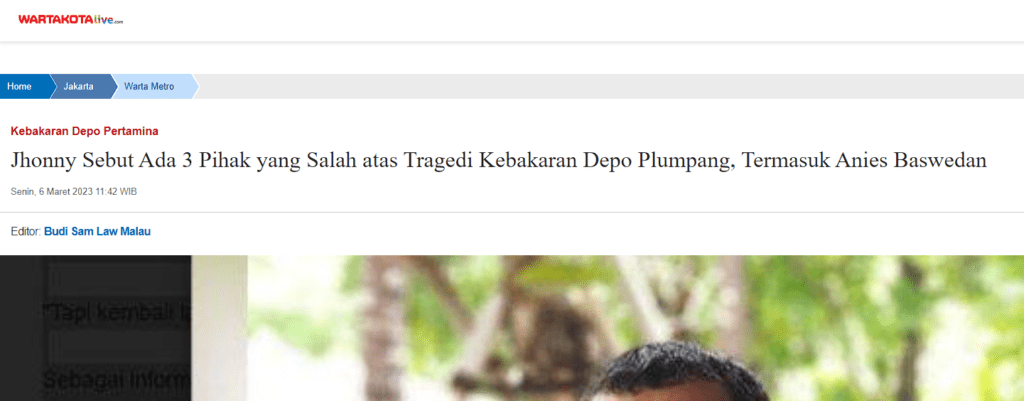 Tragedi kebakaran yang terjadi di depo plumpang, kembali ramai menjadi perbincangan. Terdapat isu yang mengkalim bahwa tragedi tersebut berkaitan dengan Anies Baswedan. Pada sebuah artikel wartakota, disebutkan anggota DPRD DKI Jakarta dari Fraksi PDIP, Jhonny Simanjuntak, mengatakan Anies Baswedan turut bersalah atas tragedi tersebut karena telah memberikan surat IMB kawasan.
