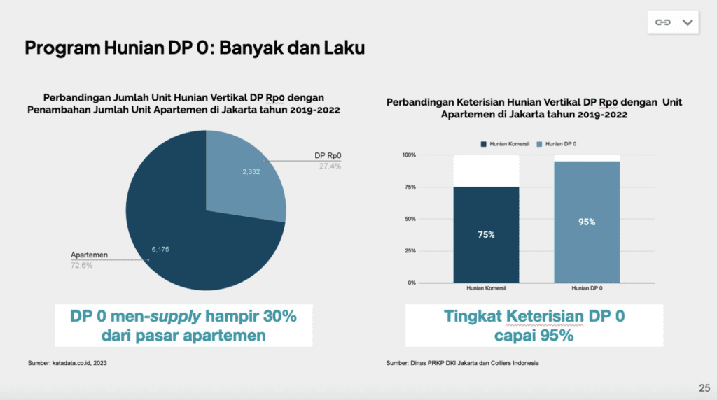 Padahal, faktanya dari tahun 2019 sampai 2022 (termasuk pada masa pandemi COVID-19), total jumlah unit rumah susun DP 0% sudah mencapai 2.332 unit atau sekitar 27,4% dari total pasokan rumah susun di provinsi DKI Jakarta.