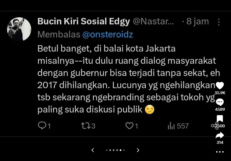 Pada Desember 2023, meja aduan Balaikota Jakarta menjadi topik hangat perbincangan warganet. Pada mulanya keramaian ini ditimbulkan akibat viralnya Desak Anies. Beberapa warganet merasa Desak Anies merupakan cara kampanye baru yang patut diapresiasi karena berhasil menciptakan ruang demokrasi publik. Namun, seiring dengan sentimen positif terdapat pula sentimen negatif yang mengklaim, “di Balai Kota Jakarta misalnya–itu dulu ruang dialog masyarakat dengan gubernur bisa terjadi tanpa sekat, 2017 dihilangkan. Lucunya yg ngehilangkan tsb sekarang ngebranding sebagai tokoh paling suka diskusi publik.”