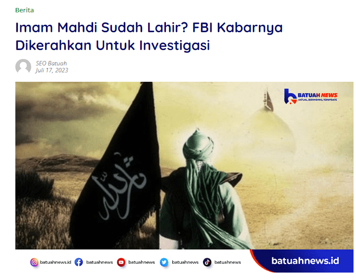 Batuah News. (2023). Imam Mahdi Sudah Lahir? FBI Kabarnya DIkerahkan untuk Investigasi. Diakses pada 29 Januari 2024 dari https://turnbackhoax.id/2023/07/24/salah-gambar-islam-protestan-mempercayai-anies-merupakan-imam-mahdi/